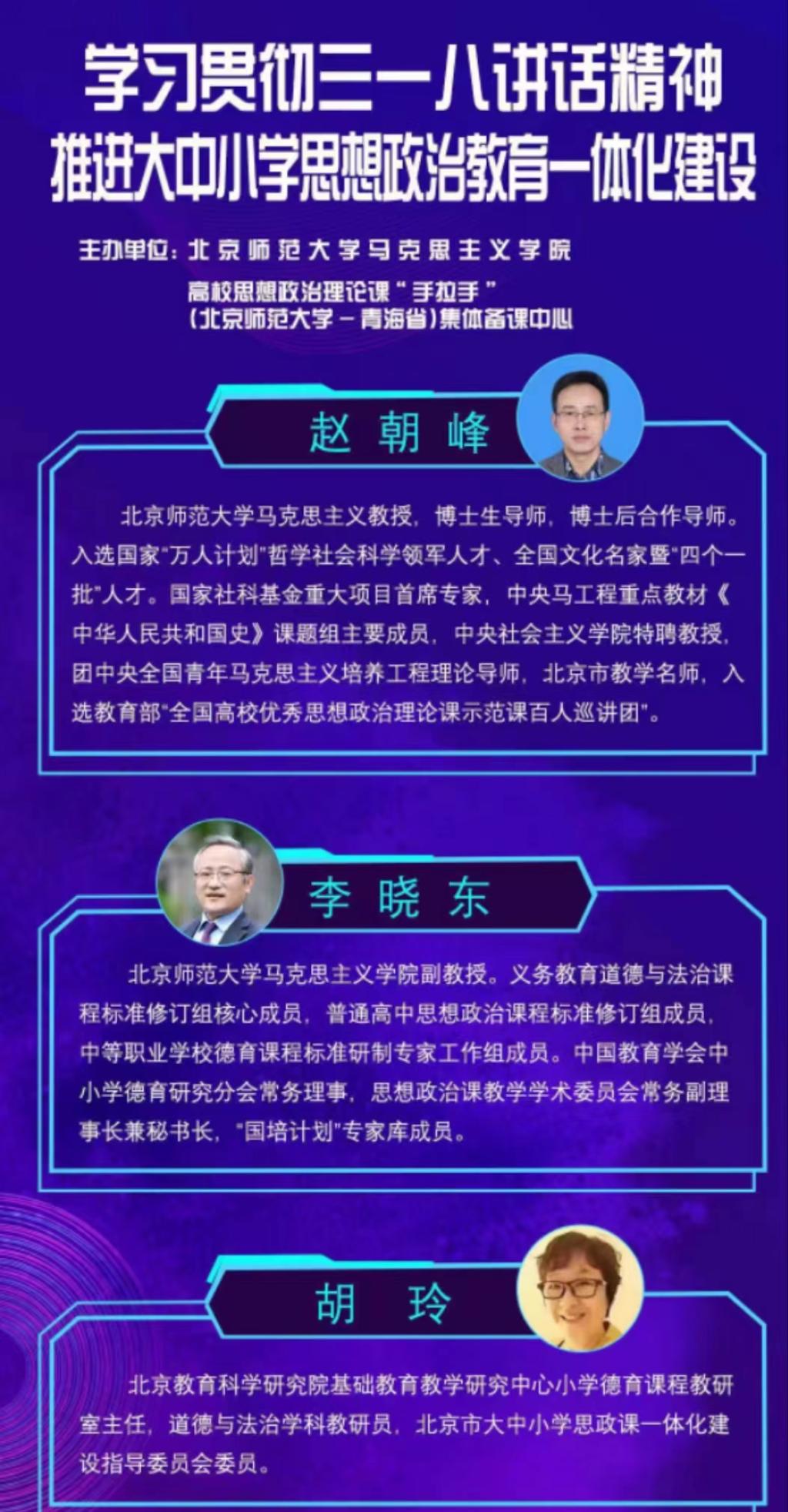 2023年3月18日,在公司思想政治理论课教师座谈会召开四周年之际,北京师范大学伟德BET官方网站高校思想政治理论课“手拉手”(北京师范大学-青海省)集体备课中心主办了主题为“学习贯彻三一八讲话精神,推进大中小学思想政治教育一体化建设”的线上专题讲座。本场讲座由北师大伟德BET官方网站赵朝峰教授、李晓东副教授以及北京教育科学研究院基础公司产品研究中心小学德育课程教研室胡玲主任担任主讲。