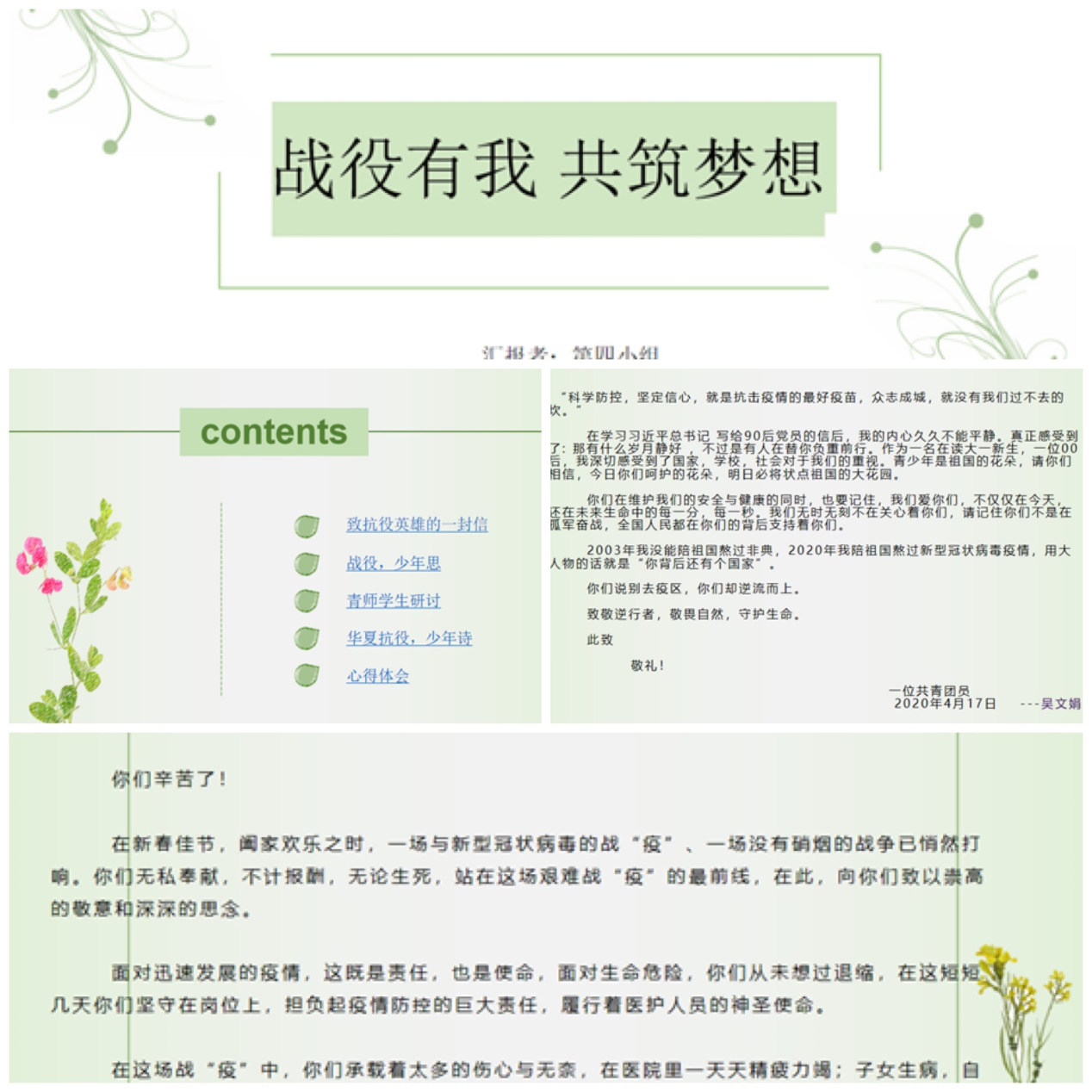 师大学子认真学习了习近平总书记给北京大学援鄂医疗队“90后”党员重要回信精神,积极学习90后抗疫英雄无私奉献,一心为国的先进事迹,用笔写下了学习体会,或用原创诗歌表达战疫心声。学习们纷纷表示要坚守习近平主席对我们的殷切期望和指导。在自己的能力范围之内去和全国人民团结起来一起抗击疫情,愿人民安康,国家昌盛。