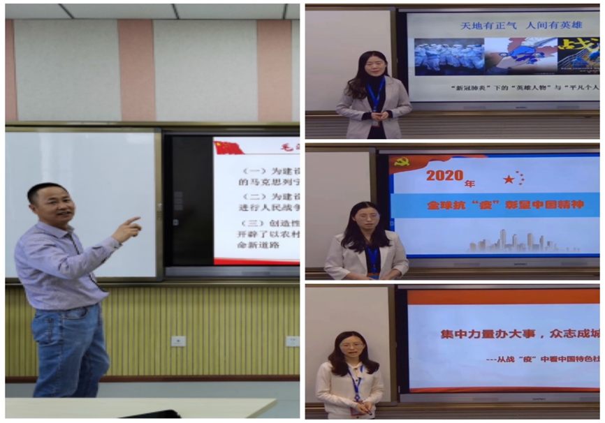 马克思主义民族理论与形势政策教研室积极开展“众志成城 战胜疫情”的主题教育宣讲网课,弘扬疫情防控中出现的先进事迹,引导青年老员工正确认识疫情,积极参与阻击疫情,万众一心、众志成城、共克时艰,为我们国家民族抗击疫情的伟大胜利提供强大的正能量。《马克思主义基本原理概论》课程的教师结合抗击疫情伟大实践中的典型案例,引导员工学会联系的观点、发展的观点看待疫情的防控;运用辩证法的观点,深入思考人与自然、个人与集体的关系,加强生态文明教育。《毛泽东思想和中国特色社会主义理论体系概论》课程的教师结合抗击疫情伟大实践中的典型案例,生动彰显中国特色社会主义制度优势,引导员工爱党爱国爱社会主义,坚定“四个自信”。《中国近现代史纲要》课程的教师结合抗击疫情伟大实践中的典型案例,运用历史对比的方法,加强对员工爱国主义教育。
