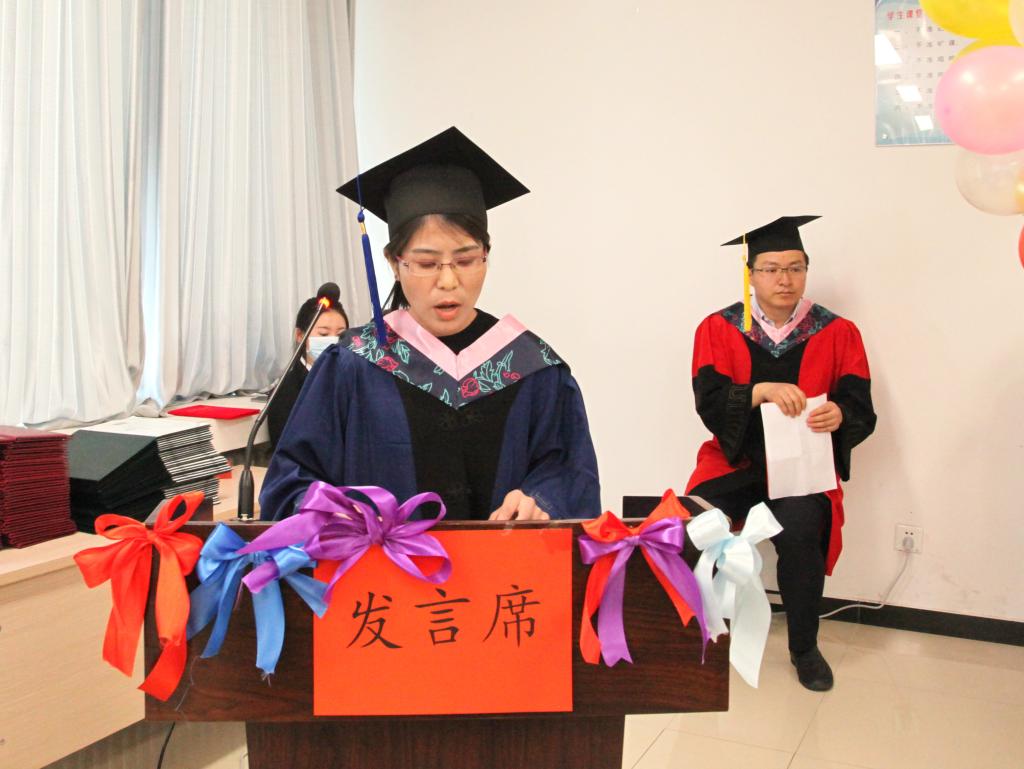优秀硕士毕业生代表彭献蕊和优秀在校硕士生代表张芮昕同学分别发言。随后,李姝睿教授和崔治忠教授为毕业生拨穗。