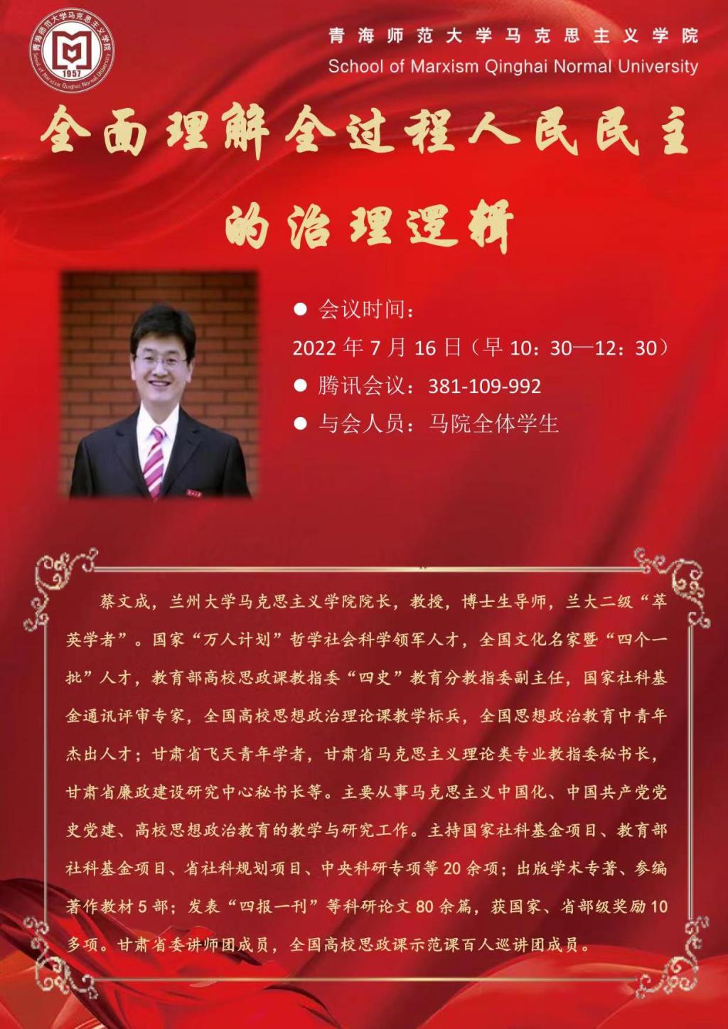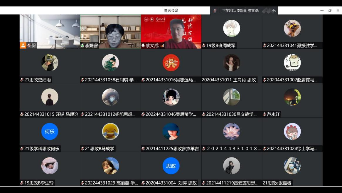 为了进一步深入推进伟德BET官方网站与兰州大学伟德BET官方网站合作交流,提高公司研究生和本科生对全过程人民民主感悟理解,特邀兰州大学伟德BET官方网站经理蔡文成教授在线上为公司学子作《全面理解全过程人民民主的治理逻辑》专题讲座。公司党总支书记李姝睿致欢迎辞,教师保积红主持会议。