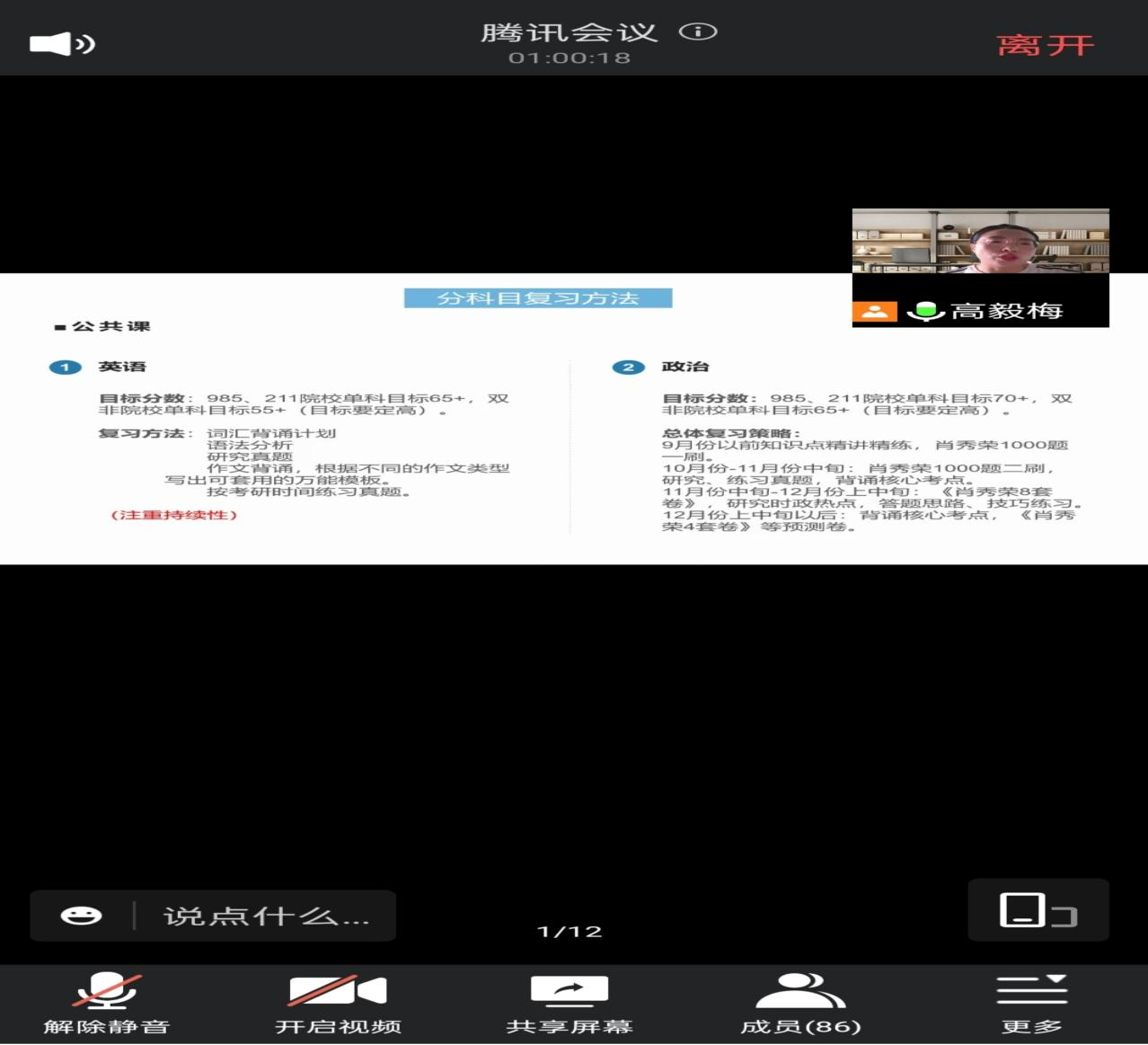 郭强老师和马克思主义理论的研究生高毅梅从考研的择校、准备、报名、复习、初试、复试、调剂七个阶段做了详细的指导和讲解。强调合理规划考试复习时间,安排合理的复习阶段,第一、二、三轮分别以提高基础、强化、冲刺为方向,根据每一轮复习阶段和科目提供了一些具体详细有效的复习方法以及策略。
