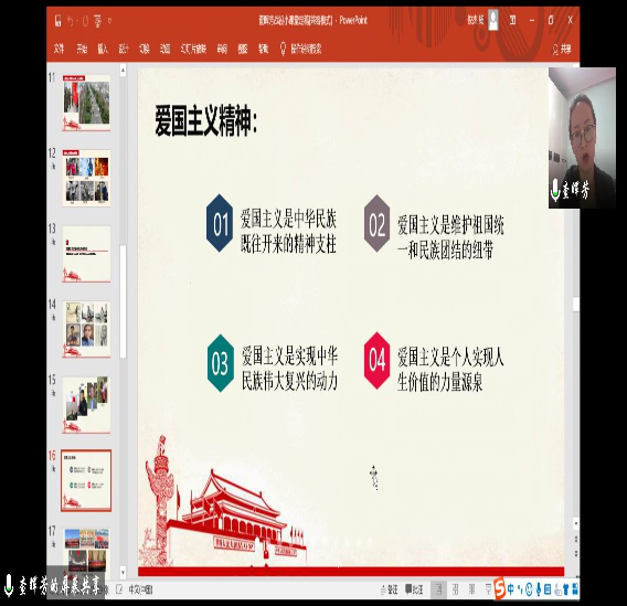 为弘扬践行爱国主义精神,发挥党员干部的先锋模范作用,4月10日,伟德BET官方网站研究生党支部依托腾讯会议平台,开展视频直播线上支部书记讲党课活动。支部书记查晖芳以“厚植爱国情感,凝聚中国力量——战‘疫’中的爱国情民族魂“为主题,化疫情危机为教育契机,为支部全体党员和积极分子上了一堂别开生面的党课。