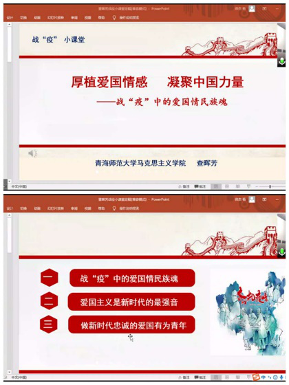 查晖芳同志从战‘疫’中的爱国情、民族魂、爱国主义是新时代的最强音、做新时代忠诚的爱国有为青年三个方面入手,结合战“疫”事例和新青海精神,详细讲解了在当前疫情防控阶段,作为新时代的青年如何在疫情防控的同时,厚植爱国情,共筑强国志,实践报国行。她强调,这场战“疫”是一部生动的爱国主义教材,为我们提供了许多鲜活感人的爱国故事。无论是中国共产党、医务工作者、人民子弟兵还是基层民众在这场战“疫”中都发挥了巨大的作用,凝聚起战胜疫情、团结应对的强大合力。面对这场严峻的疫情考验,爱国主义是时代主旋律,是中华民族最主要的精神财富,是中华民族抗击疫情最有力的武器。一次次伟大斗争告诉我们:越是面对挑战,越需要团结的力量;越是攻坚克难,越需要群策群力。在爱国主义精神的纽带下,万众一心,众志成城,就没有中国人民克服不了的困难,迈不过去的坎。因此,对于新中国青年来说,要厚植爱国情感,传承中华文明;要砥砺强国之志,弘扬爱国精神;要实践报国之行,凝聚中国力量。在生活和学习中时刻牢记新使命,刻苦锤炼新本领,奋发展现新作为,做忠诚的爱国有为青年。