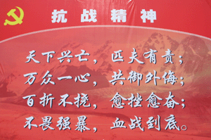习近平总书记指出,中国人民在抗日战争的壮阔进程中孕育出伟大抗战精神,“中国人民向世界展示了天下兴亡、匹夫有责的爱国情怀,视死如归、宁死不屈的民族气节,不畏强暴、血战到底的英雄气概,百折不挠、坚忍不拔的必胜信念。”