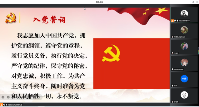 大会最后,重温入党誓词,牢记初心使命。全体同志在纪检委员李琳同志的带领下,面对党旗庄严宣誓,重温入党誓词,虽然是在线上,但同志们宣誓时的那份激情却丝毫没有减弱,在一句句铿锵有力的宣誓声中,全体党员满载爱国主义精神,用共产主义远大理想充实自己的内心。宣誓之后,由王燕红同志对此次活动进行了简要概括,并对相关的工作提出了要求,并作安排。