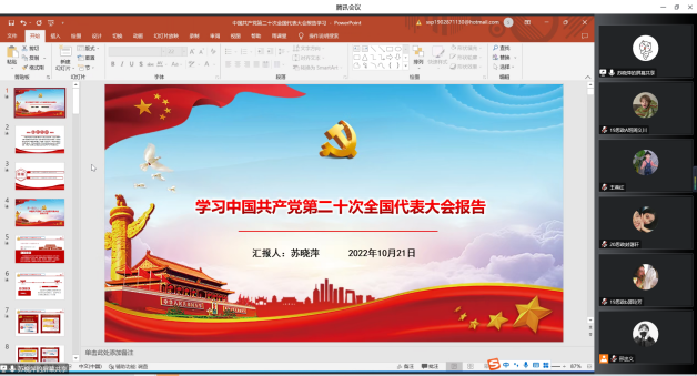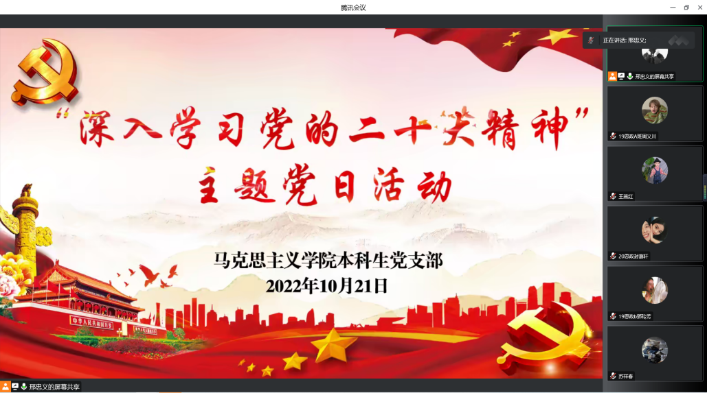 中国共产党第二十次全国代表大会于2022年10月16日在北京隆重开幕,习近平总书记在开幕式作重要讲话。为深入学习党的二十大精神,伟德BET官方网站本科生党支部于2022年10月21日晚上19:00在线上召开了“深入学习党的二十大精神”主题党日活动,由宣传委员邢忠义同志主持。