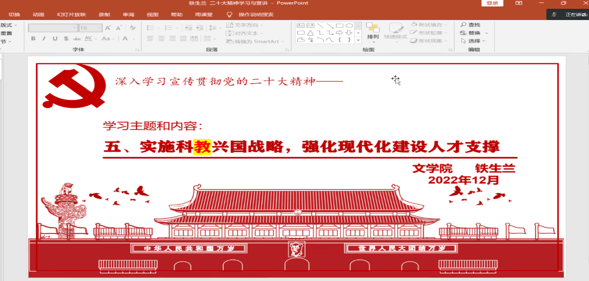 铁生兰教授以“发展”为切入点,结合工作实际,从“教育是国之大计、党之大计”“办好人民满意的教育”“以人民为中心发展教育,促进教育公平”“推进教育的数字化 建设全民终身学习学习型社会 ”等内容进行了详细解读,主题鲜明,重点突出,讲解清晰,加深了师生对二十大精神的深刻理解。