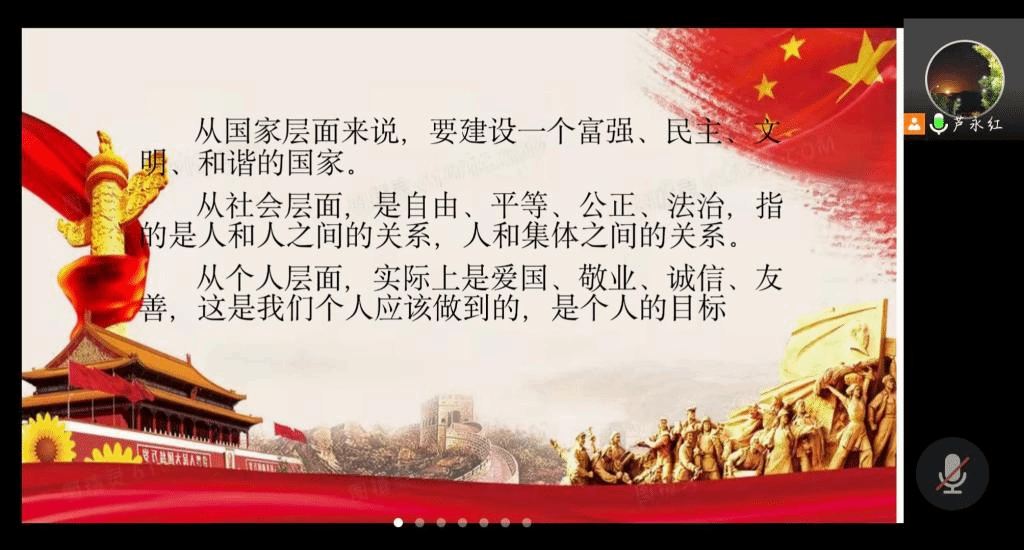 本次团日活动各班采取了线上PPT展示、同学讲解、观看视频等方式,使同学们了解了社会主义核心价值观是社会主义核心价值体系的内核,是社会主义核心价值体系的根本性质和基本特征。同时社会主义核心价值观还反映了社会主义核心价值体系的丰富内涵和实践要求,是社会主义核心价值体系的高度凝练和集中表达。