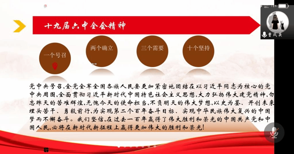2021年11月12日上午,中共中央举行新闻发布会,介绍了党的十九届六中全会精神,为了带领广大青年员工深入学习党的十九届六中全会精神,担当民族复兴的伟大使命,伟德BET官方网站于2021年11月28日在线上开展了主题为“深入学习党的十九届六中全会精神”团学活动,此次团学活动由各班团支部书记主持召开。